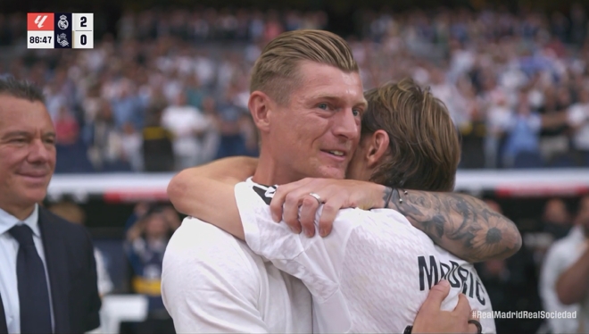 莫德里奇完成皇马主场最后一舞,和自己的老搭档已经退役的克罗斯紧紧相拥!